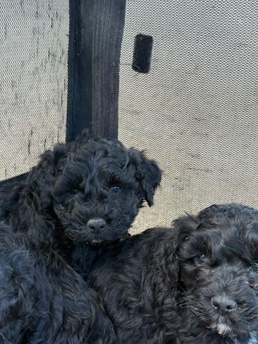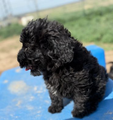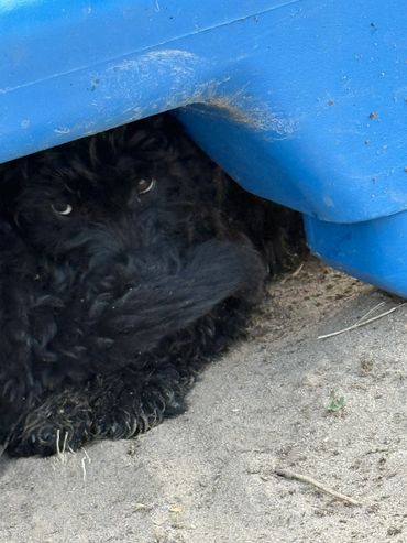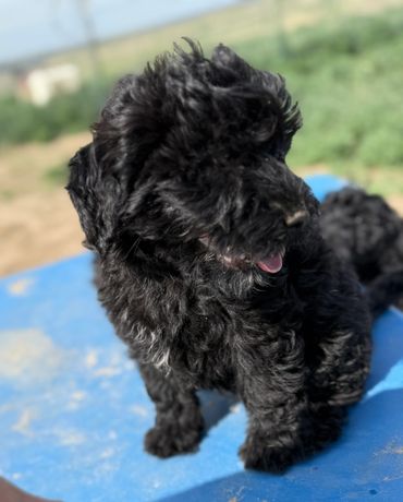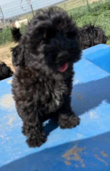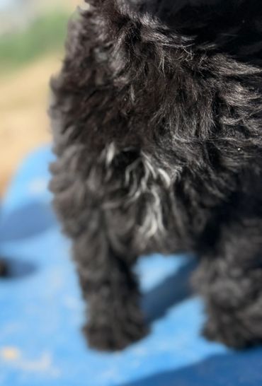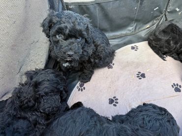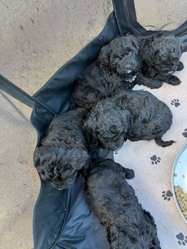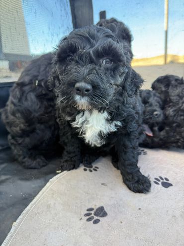 The boys of the PWD/Wheaten mix bred to Portuguese. F1B Great mix of personalities. Both parents are wavy. Mostly black a couple have small tuxedo. They are exploring their world. I let them hang out with some of the other Portuguese and they just follow them learning about their world. Ready to go to new homes soon. Second week of June. They will have a Vet appointment. They will be microchipped, come with all the medical ie shots and worming dates,